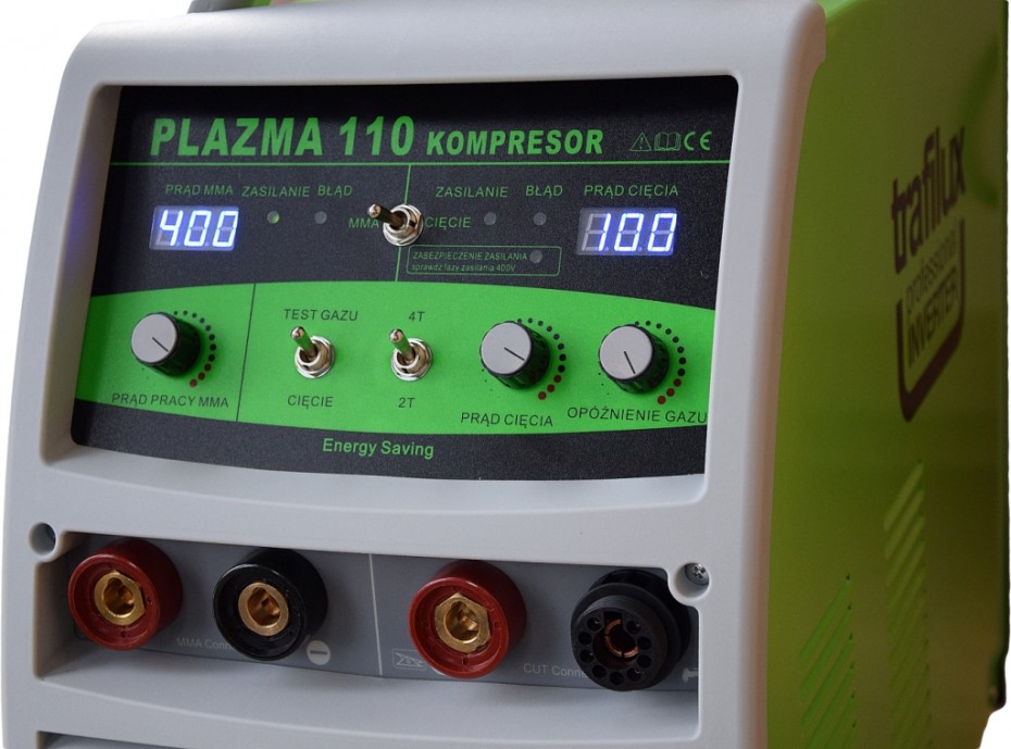Inwerterowa przecinarka plazmowa do cięcia ręcznego, Zasilana z sieci 3-fazowej, Wyposażona w system zajarzania bezstykowego HF. Przeznaczona do prac w warunkach przemysłowych, warsztatowych, produkcyjnych. Swoje zastosowanie znajduję w zamkniętych pomieszczeniach, jak i pracach terenowych np. przy cięciu złomu, odpadów metalowych. Zaletą tego urządzenia jest wysoka jakość wykonania i trwałość zastosowanych komponentów elektronicznych. Plazma 110 posiada wbudowany kompresor, cyfrowy wyświetlacz prądu cięcia, płynną regulację opóźnienia wypływu gazu, oraz 2takt/4takt, Urządzenie wyposażone w moduł spawalniczy MMA z prądem pracy do 400A. Na tylnym panelu znajduję się wbudowany zespół przygotowania powietrza z reduktorem i manometrem. Urządzenie służy do cięcia różnego rodzaju metali, w tym stopów stali, miedzi, mosiądzu, aluminium. Przecinarka plazmowa TRAFILUX, zapewnia możliwość cięcia w wielu płaszczyznach, oraz w trudno dostępnych miejscach. Palnik plazmowy dołączony do urządzenia to popularny typ panika A101, który umożliwia zastosowanie różnego rodzaju nasadek oraz dysz tnących, dzięki czemu istnieje możliwość konfiguracji palnika pod indywidualne potrzeby użytkownika. Atutem konstrukcyjnym urządzenia są tranzystory wykonane w technologii IGBT. Cechą charakterystyczną dla tego typu tranzystorów jest, mniejsze zużycie energii, mniejsze zakłócenia elektromagnetyczne, przy większej wydajności oraz mocniejszym i stabilniejszym łuku.
