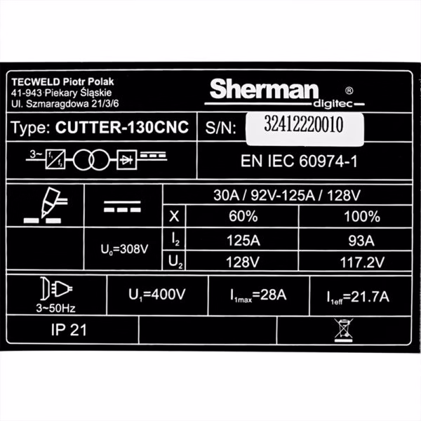 125A Przecinarka plazmowa CUTTER 130CNC + manual do stołów i ploterów CNC z możliwością cięcia ręcznego SHERMAN (TEC0236)