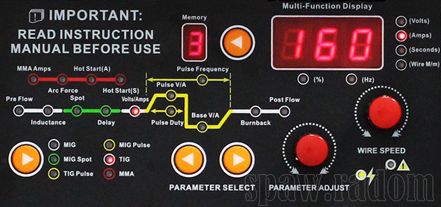 4. PULS – funkcja prądu pulsującego, wykorzystywana jest głównie przy spawaniu cienkich elementów (nawet o grubości 0,1mm), metali o niskiej temperaturze topnienia np. ołów, lub spawaniu w pozycjach przymusowych. Innymi zaletami spawania prądem pulsującym są mniejsza strefa wpływu ciepła, większa stabilność łuku spawalniczego oraz większa głębokość wtopienia i polepszenie wyglądu lica spoiny.