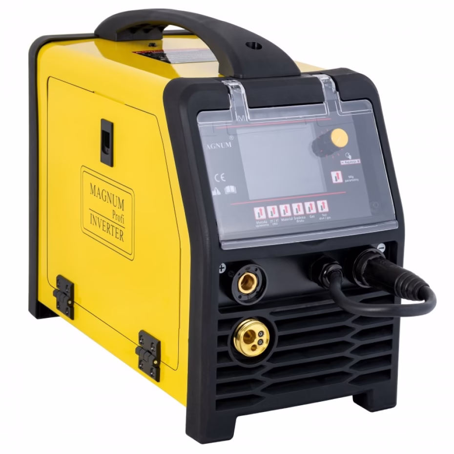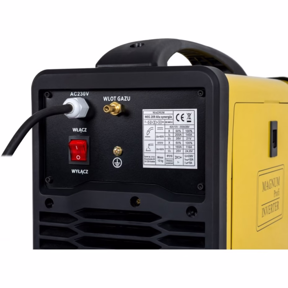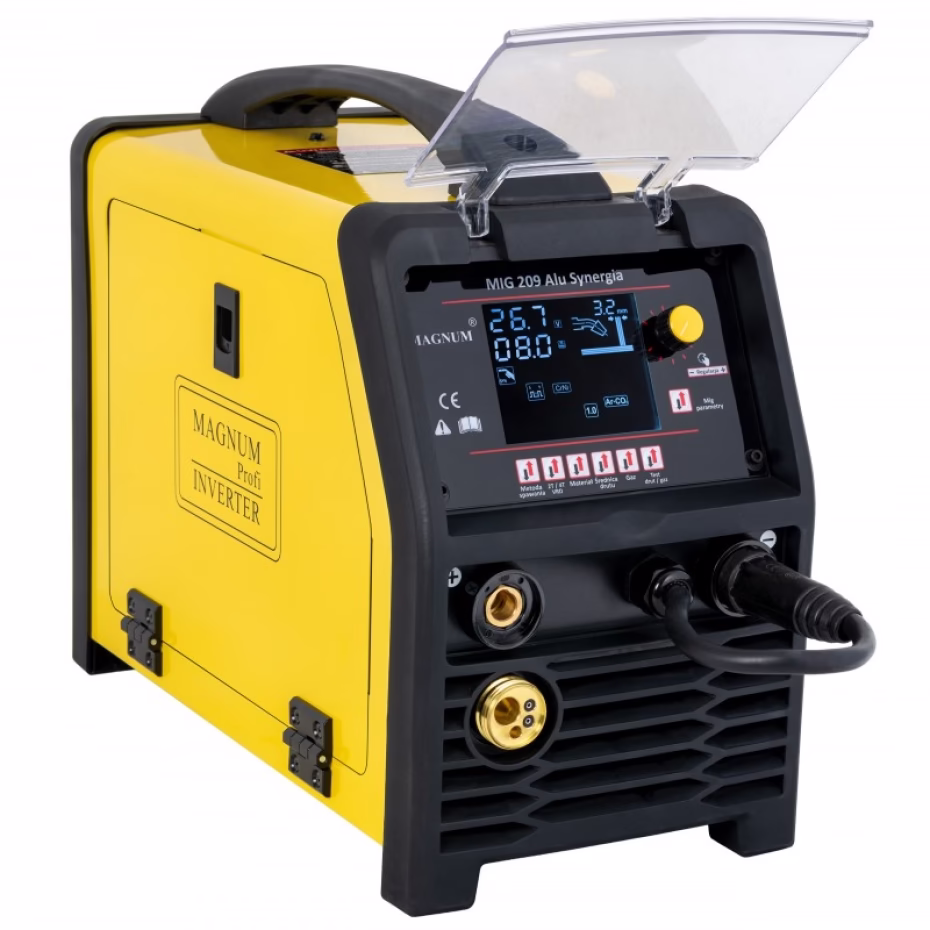Urządzenie MAGNUM MIG 209 Alu Synergia jest profesjonalnym, synergicznym półautomatem spawalniczym, przeznaczonym do ręcznego, elektrycznego spawania stali niskowęglowej, niskostopowej (MAG), stali stopowych oraz aluminium i jego stopów (MIG). Urządzeniem można również LUTOSPAWAĆ, spawać metodą MMA oraz metodą TIG Lift. Przeznaczone jest do wszelkiego rodzaju prac spawalniczych, w warsztatach ślusarskich, warsztatach naprawczych, przemysłowych, fabrykach itp. Dzięki zastosowaniu ustawień synergicznych i czytelnego ekranu LCD, urządzenie jest niezwykle proste w obsłudze i może być użytkowane przez spawaczy nawet z minimalnym doświadczeniem. Źródło prądu zostało zbudowane w oparciu o tranzystory IGBT zapewniające minimum zakłóceń elektromagnetycznych, umożliwiające zwiększenie wydajności i niezawodności źródła prądu, mniejsze zużycie energii, oraz błyskawiczne dostosowanie prądu do zmian parametrów w czasie spawania.