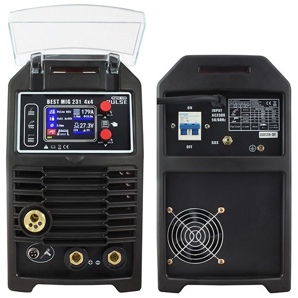 Urządzenie BEST MIG 231 4×4 PULSE służą do ręcznego spawania łukowego w metodzie GMAW – MIG/MAG, TIG lift DC (Tungsten Inert Gas) oraz MMA. Przystosowane do zasilania z sieci jednofazowej 230V, 50/60Hz. Urządzenie posiada, płynną regulację prądu spawania oraz wyposażone jest w przeciążeniowy układ zabezpieczenia termicznego zapobiegający przed przegrzaniem. BEST MIG231 PULSE 4×4 wyposażony jest w funkcje: spawania prądem o pojedynczej pulsacji, spawania prądem o podwójnej pulsacji, opcję spawania TIG lift elektrodą nietopliwą w osłonie gazów obojętnych oraz elektrodą otuloną MMA.