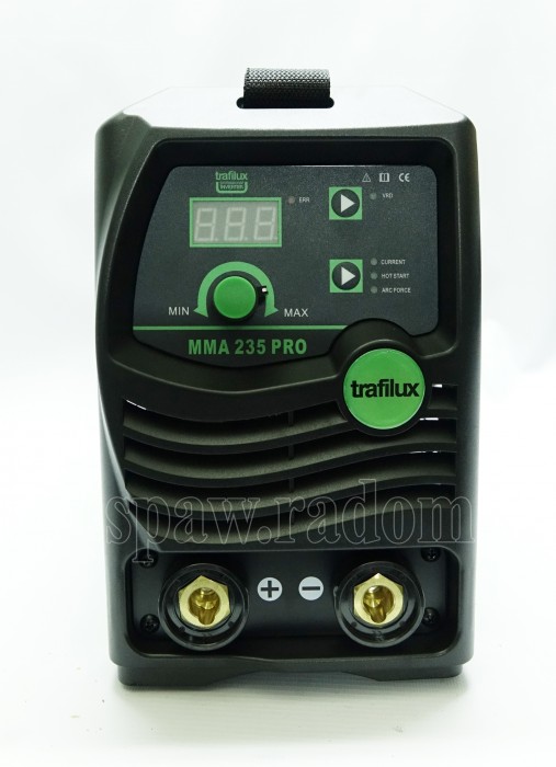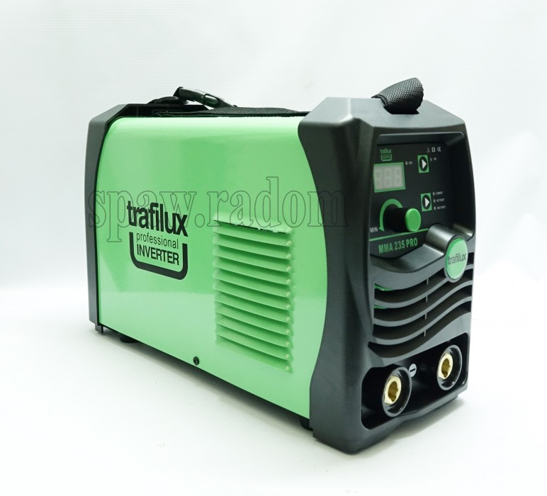 TRAFILUX MMA 235PRO to lekkie, przenośne inweterowe urządzenie zapewniające możliwość spawania elektrodami otulonymi. Nadaje się do użytkowania warunkach gospodarstwa domowego oraz warsztatowych. Idealnie sprawdzi się podczas prac naprawczych, montażowych oraz zadań w terenie. Zaletą urządzenia jest płynna regulacja prądu spawania, dynamiki łuku (ARC FORCE), oraz zakresu gorącego startu (HOT START). Charakterystyka urządzenia pozwala na użycie elektrod otulonych w zakresie 1.6- 5.0 mm, dodatkowo urządzenie posiada moduł VRD, mający na celu zwiększenie bezpieczeństwa użytkownika, pracującego w niebezpiecznym środowisku, które zwiększa ryzyko porażenia prądem. W szczególności praca w miejscach, gdzie mamy do czynienia z wysoką wilgotnością powietrza oraz stycznością spawacza z cieczami np. podczas prac przy kanalizacjach, prac przy wykopach lub w elektrociepłowniach. Urządzenie służy do spawania stali, z uwzględnieniem stali nierdzewnej, żaroodpornej oraz żeliwa. Atutem konstrukcyjnym urządzenia są tranzystory wykonane w technologii IGBT. Cechą charakterystyczną dla tego typu tranzystorów jest, mniejsze zużycie energii, mniejsze zakłócenia elektromagnetyczne, przy większej wydajności oraz mocniejszym i stabilniejszym łuku spawalniczym.