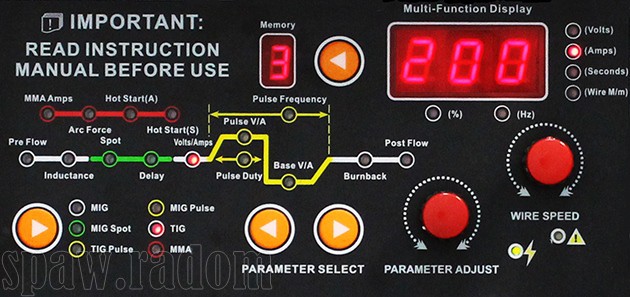 - PULS – funkcja prądu pulsującego, wykorzystywana jest głównie przy spawaniu cienkich elementów (nawet o grubości 0,1mm), metali o niskiej temperaturze topnienia np. ołów, lub spawaniu w pozycjach przymusowych. Innymi zaletami spawania prądem pulsującym są mniejsza strefa wpływu ciepła, większa stabilność łuku spawalniczego oraz większa głębokość wtopienia i polepszenie wyglądu lica spoiny.