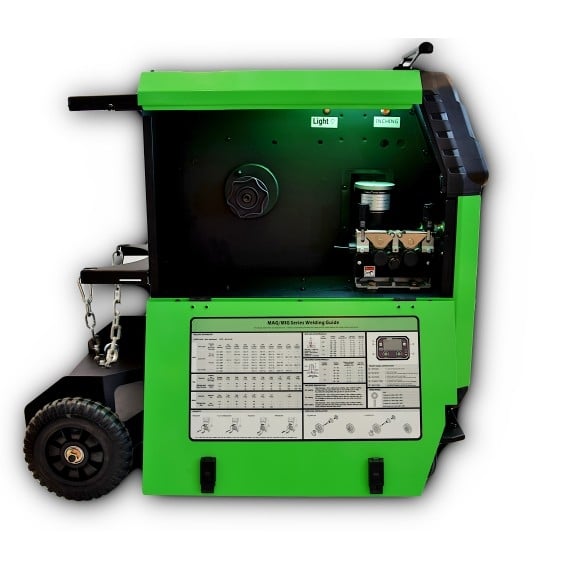 To profesjonalny inwertorowy półautomat spawalniczy przeznaczony do pracy w warunkach przemysłowych dający możliwość spawania konstrukcji ciężkich. Urządzenie wyposażone jest w solidne podwozie transportowe. Rozbudowana funkcjonalność urządzenia pozwala na pracę w trybach MIG/MAG, MMA, TIG CuSi3. Półautomat synergiczny posiadający możliwość podwójnej pulsacji w metodzie MIG/MAG, dzięki której jakość spoiny, nie odbiega jakościowo od spoiny uzyskanej w metodzie TIG. Półautomat spawalniczy wyposażony w czytelny ekran LCD oraz Menu w 5 językach daje możliwość pracy w trybach: – 1 Puls – pojedyncza pulsacja MIG/MAG – 2 Puls – podwójna pulsacja MIG/MAG – 2 takt/4takt – możliwość wyboru dwóch trybów – s2T, s4T – wykres przebiegu spawania tak jak w metodzie TIG – SPOT – możliwość spawania punktowego oraz możliwość lutospawania. Urządzenie może pracować w metodzie TIG w trybach pracy: 2takt/4takt/SPOT, dając możliwość na regulację prądu narastania, opadania, wypełnienia krateru. Czasu opadania oraz narastania prądu, wyprzedzenia i opóźnienia wypływu gazu. Urządzenie może pracować w metodzie MMA – dając możliwość regulacji Wartość natężenia prądu, dynamiki łuku ARC FORCE, HOT Startu – prądu Gorącego startu ułatwiającego zajarzenie elektrody. Urządzenie umożliwia zapisywanie parametrów pracy dzięki wbudowanej 18 kanałowej pamięci. Atutem konstrukcyjnym urządzenia są tranzystory wykonane w technologii IGBT. Cechą charakterystyczną dla tego typu tranzystorów jest, mniejsze zużycie energii, mniejsze zakłócenia elektromagnetyczne, przy większej wydajności oraz mocniejszym i stabilniejszym łuku spawalniczym.