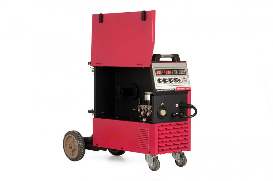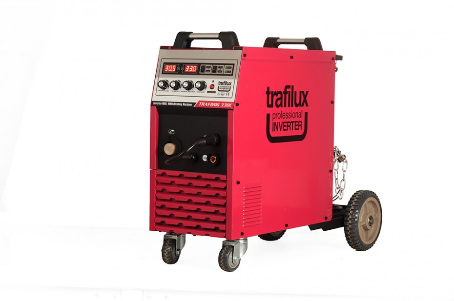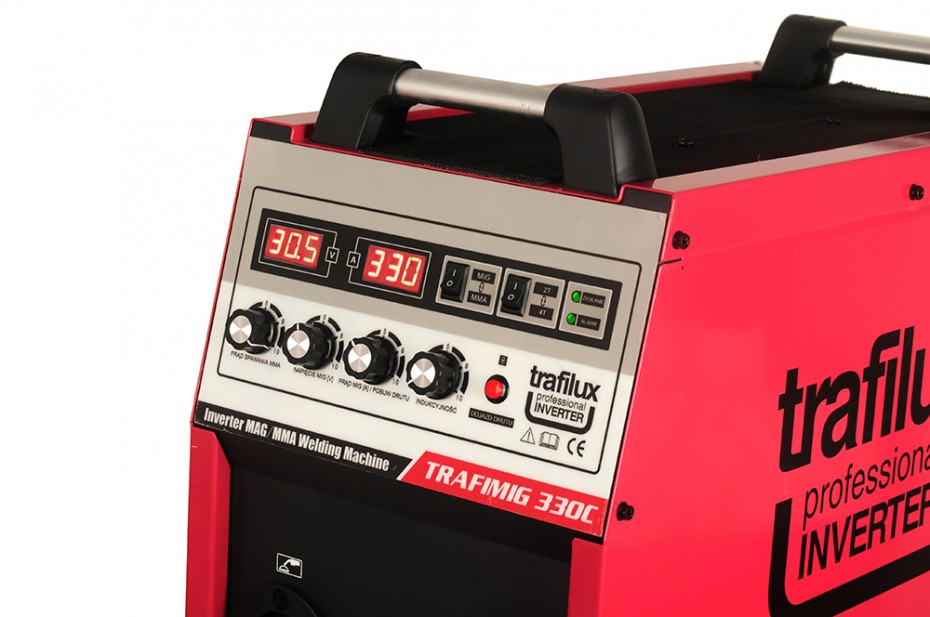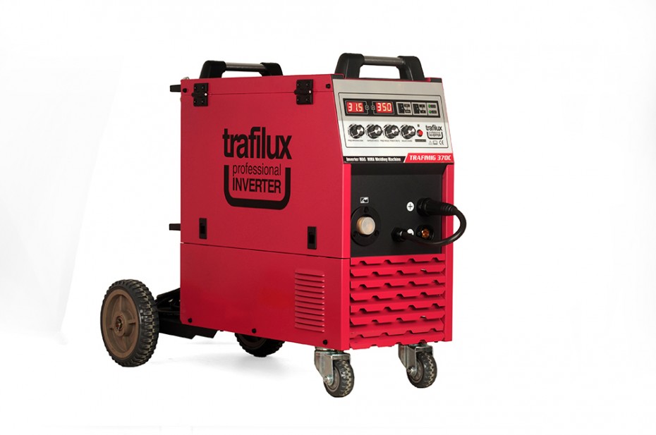 TRAFILUX TRAFIMIG 370C to profesjonalny inwerterowy półautomat spawalniczy, znajdujący swoje zastosowanie w spawaniu stali niskowęglowej, iskostopowej MAG, stali stopowej MIG oraz stopów aluminium. Urządzenie zapewnia możliwość spawania elektrodami otulonymi (funkcja MMA) oraz pracy w trybie TIG lift. Urządzenie zasilane jest z sieci trójfazowej 400V z przeznaczeniem do spawania konstrukcji średnich oraz lekkich w warunkach warsztatowych, dając stabilne parametry spawalnicze przy użyciu szczytowego prądu pracy. Duże koła transportowe dają możliwość przemieszczania spawarki po nierównym podłożu, dodatkowo spawarka posiada takie funkcję jak, 2takt, 4takt, czy też zmienną polaryzację, umożliwiającą stosowanie drutów proszkowych. Urządzenie posiada 4rolkowy mechanizm podający, który zapewnia płynny posuw drutu spawalniczego. Atutem konstrukcyjnym urządzenia są tranzystory wykonane w technologii