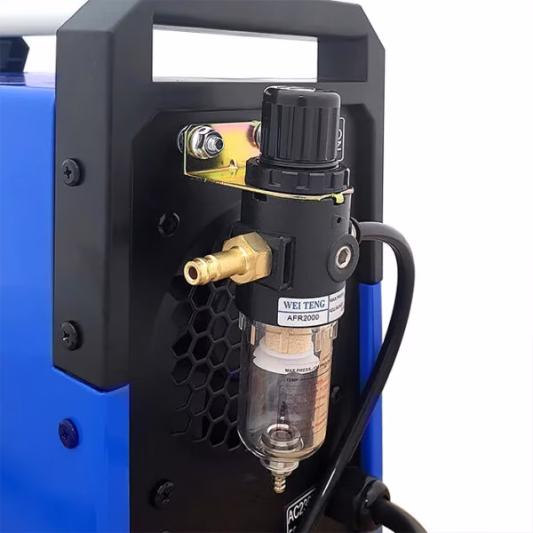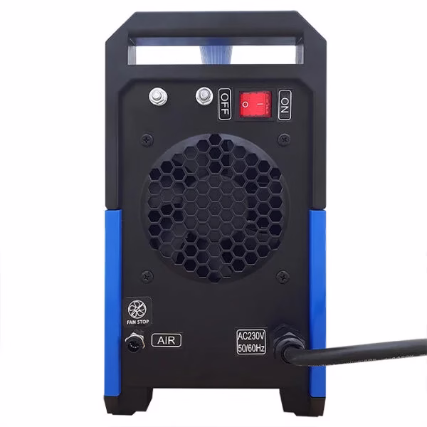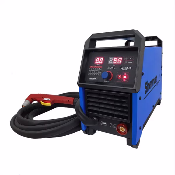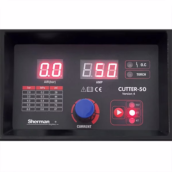 Przecinarka CUTTER 50 należy do nowej serii urządzeń wykonanych w technologii MOSFET 100kHz służących do cięcia plazmą powietrzną blach i elementów stalowych, aluminiowych i miedzianych. Sprzęt polecany jest głównie dla profesjonalistów w zakładach o dużym wykorzystaniu procesów cięcia. Znajduje zastosowanie w pomieszczeniach zamkniętych lub zadaszonych, nienarażonych na bezpośrednie działanie wpływów atmosferycznych. Urządzenie posiada uchwyt 6m standardu CEBORA z zajarzaniem jonizacyjnym HF łukiem pilotującym oraz zespół przygotowania powietrza z reduktorem i manometrem, umożliwiający regulację i kontrolę ciśnienia powietrza z panelu sterowniczego. Zastosowana funkcja Fan Stop obniża hałas przy niskim obciążeniu przecinarki.