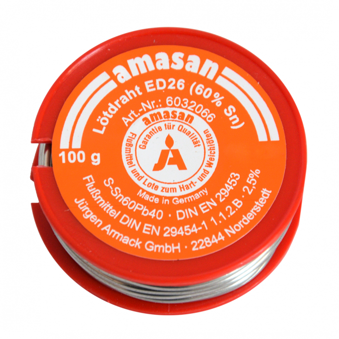 S-Sn60Pb40 (L-Sn60Pb) DIN EN 29453, rdzeń wypełniony 2,5% topnika wg DIN EN 29454-1 1.1.2.B (F-SW 26). Zakres temperatur topnienia: 183ºC – 190ºC. Topnik wykonany jest na bazie kalafonii oraz organicznego aktywatora halogenowego co powoduje, że bardzo dobrze rozpuszcza tlenki i nawilża spoinę. Ewentualne resztki topnika pozostałe po lutowaniu nie wywołują korozji na metalach nieżelaznych i mogą pozostać na spoinie.