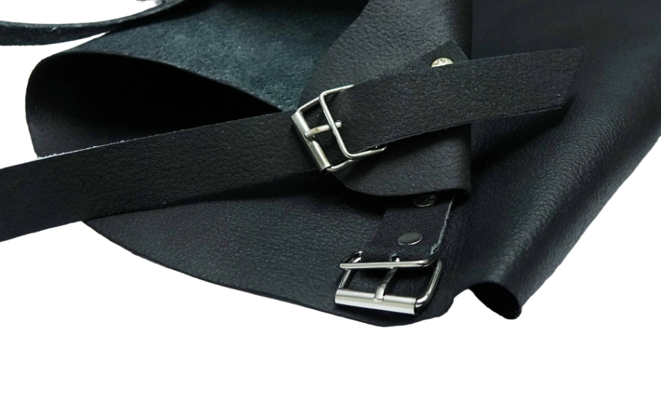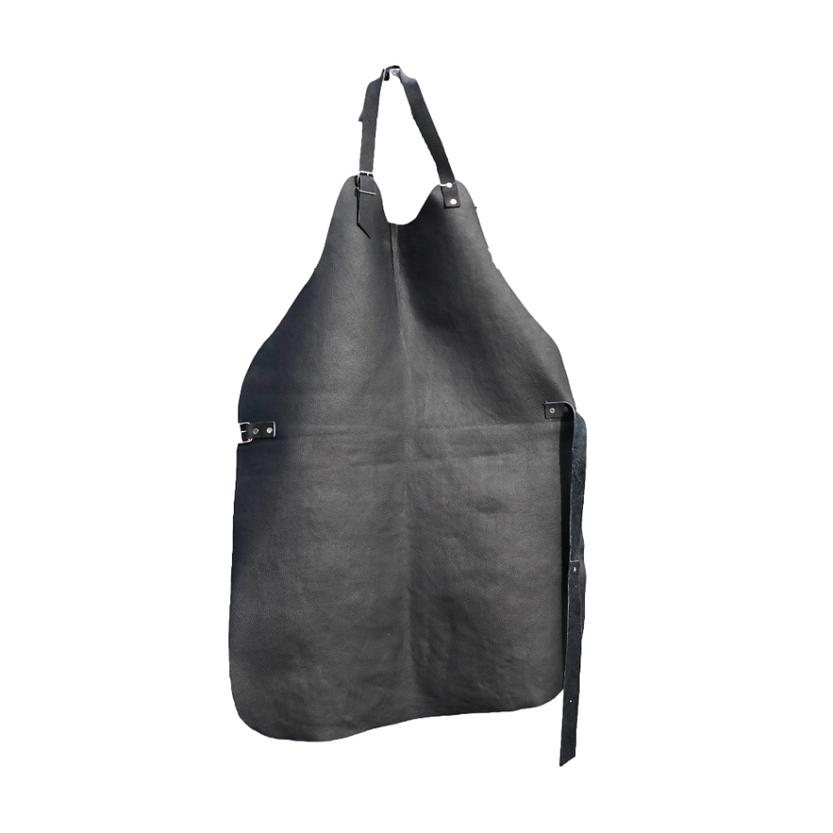 Fartuch ochronny skórzany dla spawacza wykonany z jednego elementu skóry bydlęcej krytej (licowanej) w kolorze czarnym o wysokiej jakości wyprawie chromowej nadającej skórze bardzo dobre parametry wytrzymałościowe i właściwości użytkowe. Utrzymywany szeroką szelką z dziurkami regulacyjnymi zakładaną na szyję, i zapinany z tyłu za pomocą paska z dziurkami regulacyjnymi. System regulacji umożliwia optymalne dopasowanie fartucha do wzrostu i sylwetki użytkownika. Chroni przed iskrami, małymi rozpryskami stopionego metalu, krótkotrwałym działaniem płomienia, ciepłem kontaktowym, promieniowaniem U.V. pochodzącym od łuku. Fartuch chroni również przed urazami mechanicznymi, których skutki ograniczają się do powierzchni skóry.