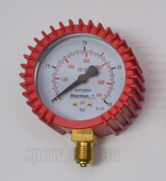 Manometr z osłoną gumową do reduktorów do acetylenu. Służy do pomiaru ciśnienia w butli. Manometr z gwintem ¼” (do reduktorów importowanych m.in. Sherman, Magnum).