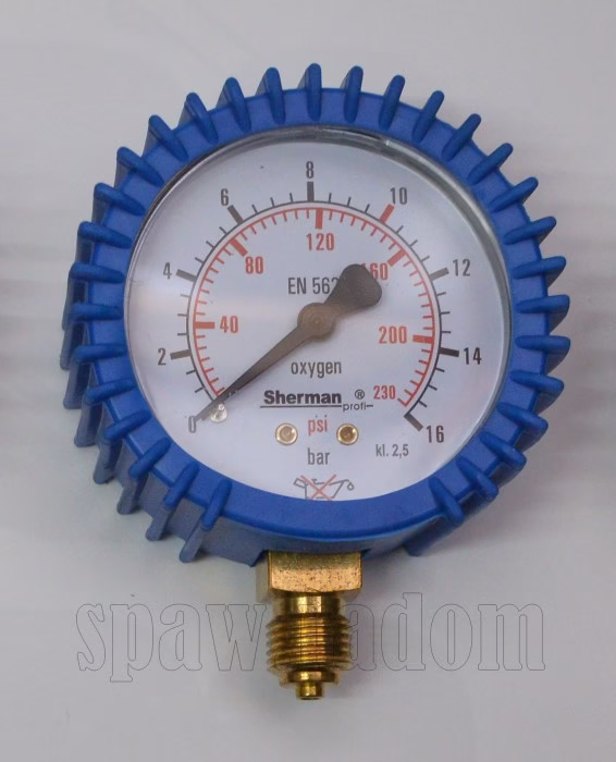 Manometr z osłoną gumową do reduktorów do tlenu. Służy do pomiaru ciśnienia roboczego. Manometr z gwintem 12×1,5 (do reduktorów krajowych m.in. Perun, Pomet).