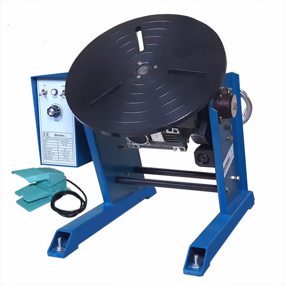 Przemysłowy pozycjoner spawalniczy o nośności 100kg to idealne narzędzie do manipulacji elementem spawanym w prostych lub półautomatycznych procesach technologicznych. Charakteryzuje się niezwykłą uniwersalnością, pozwalając na prowadzenie procesu spawania w optymalnej pozycji i przyczyniając się tym samym do poprawy jakości spawanych wyrobów. Wykorzystane rozwiązania konstrukcyjne zapewniają bezpieczną obsługę oraz bezawaryjną pracę. Pozycjoner umożliwia pochylenie tarczy w zakresie 0 – 90°. Stół wyposażony jest w montażowe rowki przyłączeniowe do mocowania uchwytów i szczęk. Urządzenie posiada płynną regulację prędkości obrotowej, oraz możliwość wyboru kierunku obrotu. Pedał sterowniczy umożliwia zdalne sterowanie (start – stop).