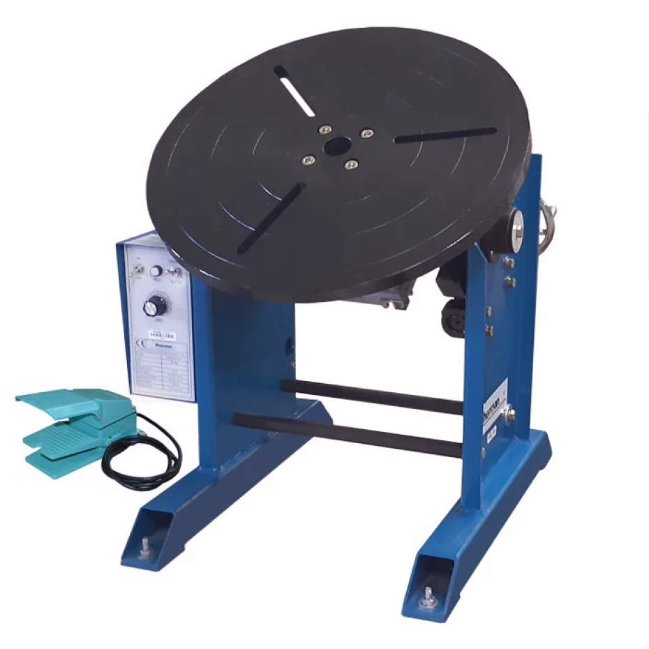 Przemysłowy pozycjoner spawalniczy o nośności 300kg to idealne narzędzie do manipulacji elementem spawanym w prostych lub półautomatycznych procesach technologicznych. Charakteryzuje się niezwykłą uniwersalnością, pozwalając na prowadzenie procesu spawania w optymalnej pozycji i przyczyniając się tym samym do poprawy jakości spawanych wyrobów. Wykorzystane rozwiązania konstrukcyjne zapewniają bezpieczną obsługę oraz bezawaryjną pracę. Pozycjoner umożliwia pochylenie tarczy w zakresie 0 – 90°. Stół wyposażony jest w montażowe rowki przyłączeniowe do mocowania uchwytów i szczęk. Urządzenie posiada płynną regulację prędkości obrotowej, oraz możliwość wyboru kierunku obrotu. Pedał sterowniczy umożliwia zdalne sterowanie (start – stop).