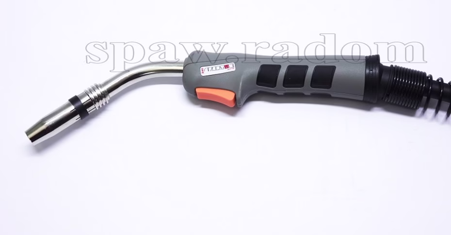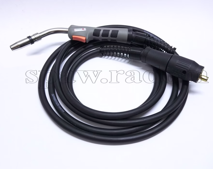 Uchwyt spawalniczy przeznaczony do spawania metodą mig/mag w osłonie gazowej. Zakończony jest wtykiem EURO, który pasuje do większości półautomatów spawalniczych. Uchwyt wyposażony jest w przewód kulowy ze sprężyną, który chroni przewód przed załamywaniem się oraz ruchome piny we wtyku EURO.
