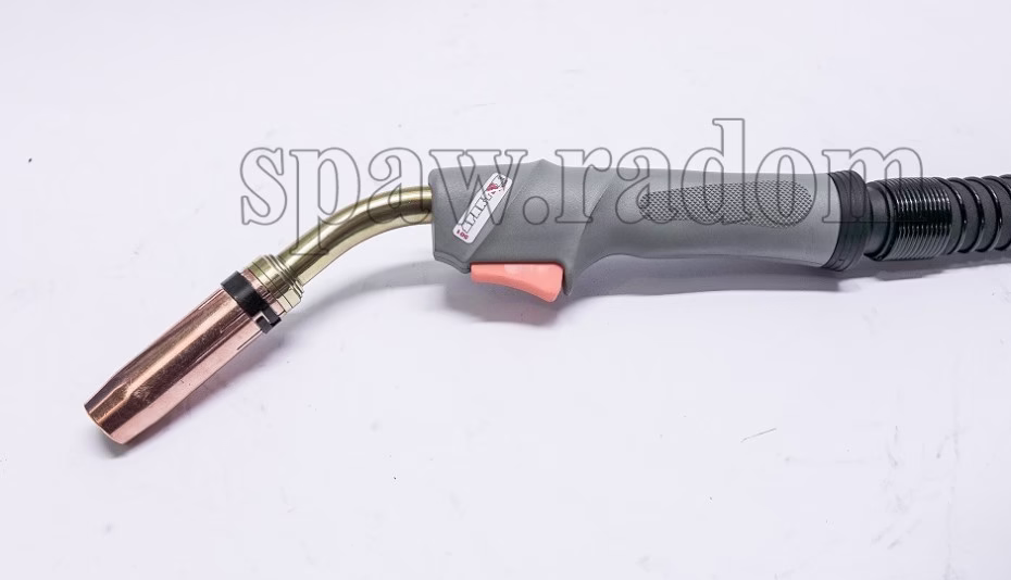 Uchwyt spawalniczy przeznaczony do spawania metodą mig/mag w osłonie gazowej. Zakończony jest wtykiem EURO, który pasuje do większości półautomatów spawalniczych. Uchwyt wyposażony jest w przewód kulowy ze sprężyną, który chroni przewód przed załamywaniem się oraz ruchome piny we wtyku EURO.