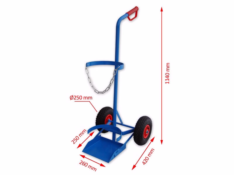 Wózek do transportu butli gazowych. Solidna, stalowa konstrukcja, zabezpieczenie butli przed spadaniem za pomocą łańcucha.